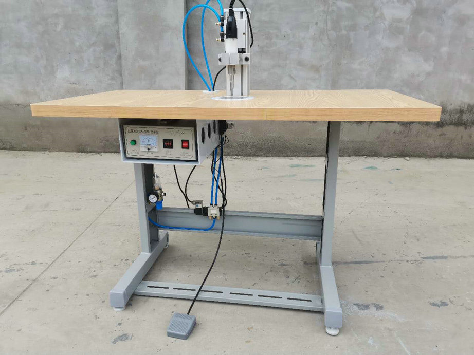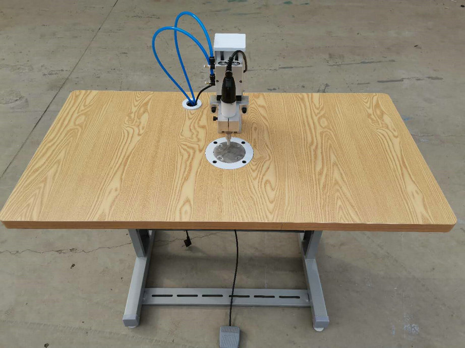 本機(jī)以超聲波將綁帶融合于口罩本體兩側(cè),進(jìn)而完成綁帶式口罩成品,只需一名操作員將口罩片置于超聲波發(fā)生器的頭上,后將綁帶放在口罩片上,腳踏踏板使氣缸向下運(yùn)動(dòng),縫住綁帶和口罩片。